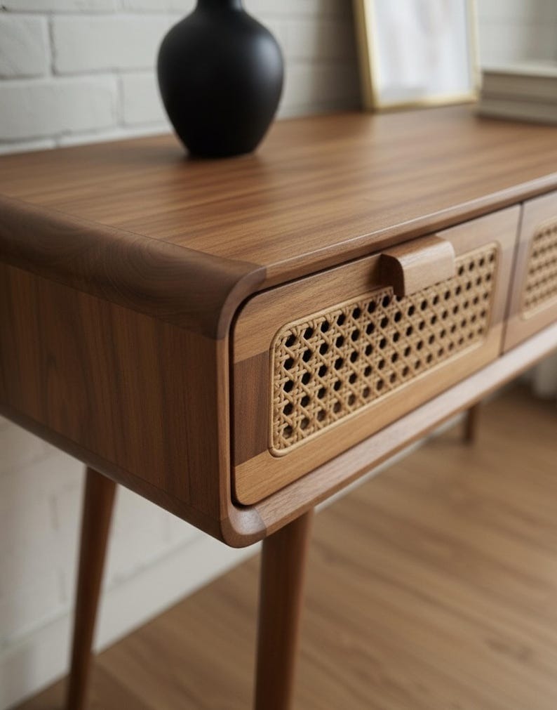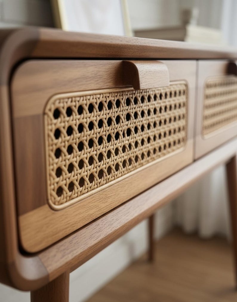 Handcrafted from premium solid wood, this mid-century console table blends natural rattan cane drawers with a smooth natural finish. Each piece is crafted by local artisans using traditional techniques, creating a warm organic texture that brings elegance to any space.