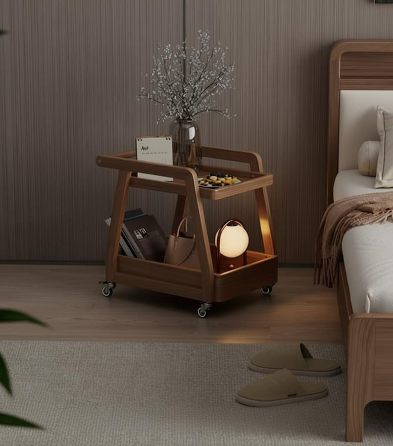 A beautifully crafted solid wood rolling cart featuring a smooth 2-tier design for storage and display. This mobile trolley works perfectly as a side table, coffee station, or serving cart, offering easy movement with durable wheels and a clean, minimalist look.
