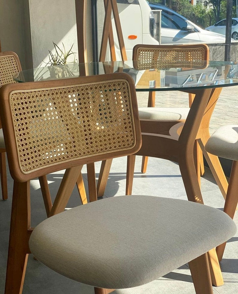 A timeless wooden dining chair featuring natural rattan cane detailing and a classic vintage silhouette. Perfect for dining rooms or living spaces, offering comfort, durability, and elegant charm.